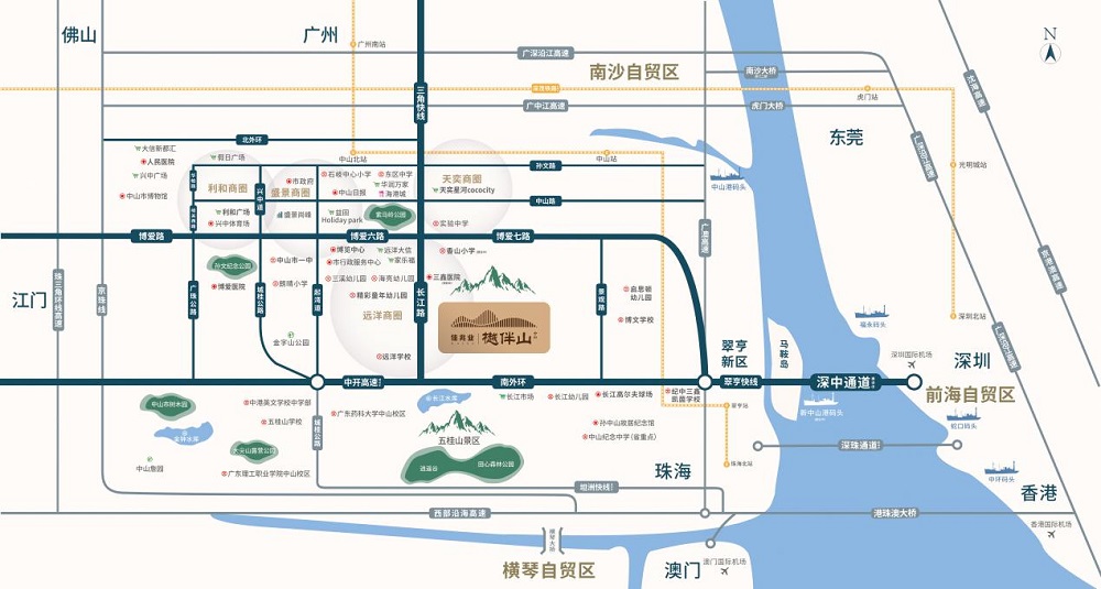 在交通上,緊鄰三條黃金走廊——博愛路、南外環、長江路,3公里接駁廣澳高速、翠亨快線,快速接駁深中通道。