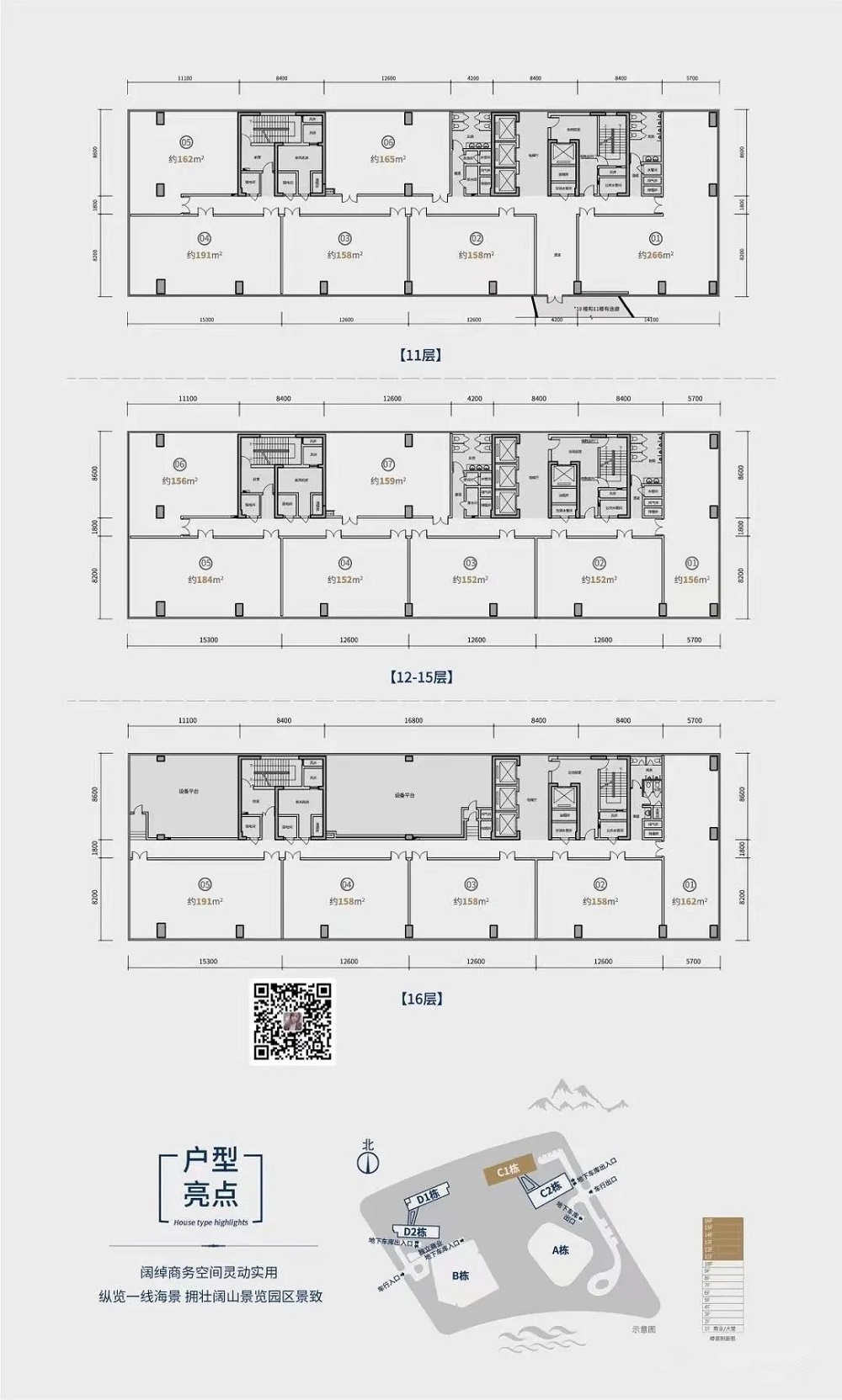 樓層狀況:D1為22層;D2棟為13層;C1棟為16層,C2棟11層,總戶數573,當期戶數427 總戶數:427套酒店式辦公,165套普通辦公